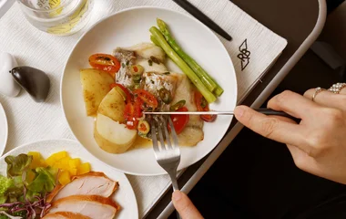 ロイヤルブルネイ航空では、ビジネスクラスでのフライトを快適にお過ごしいただくため、真心を込めたおもてなしでお迎えいたします。厳選された食材を、その持ち味を活かす最善の方法で調理いたしました。前菜からデザートまで、上質なサービスとともに楽しむひとときは、旅の始まりをより特別にしてくれます。